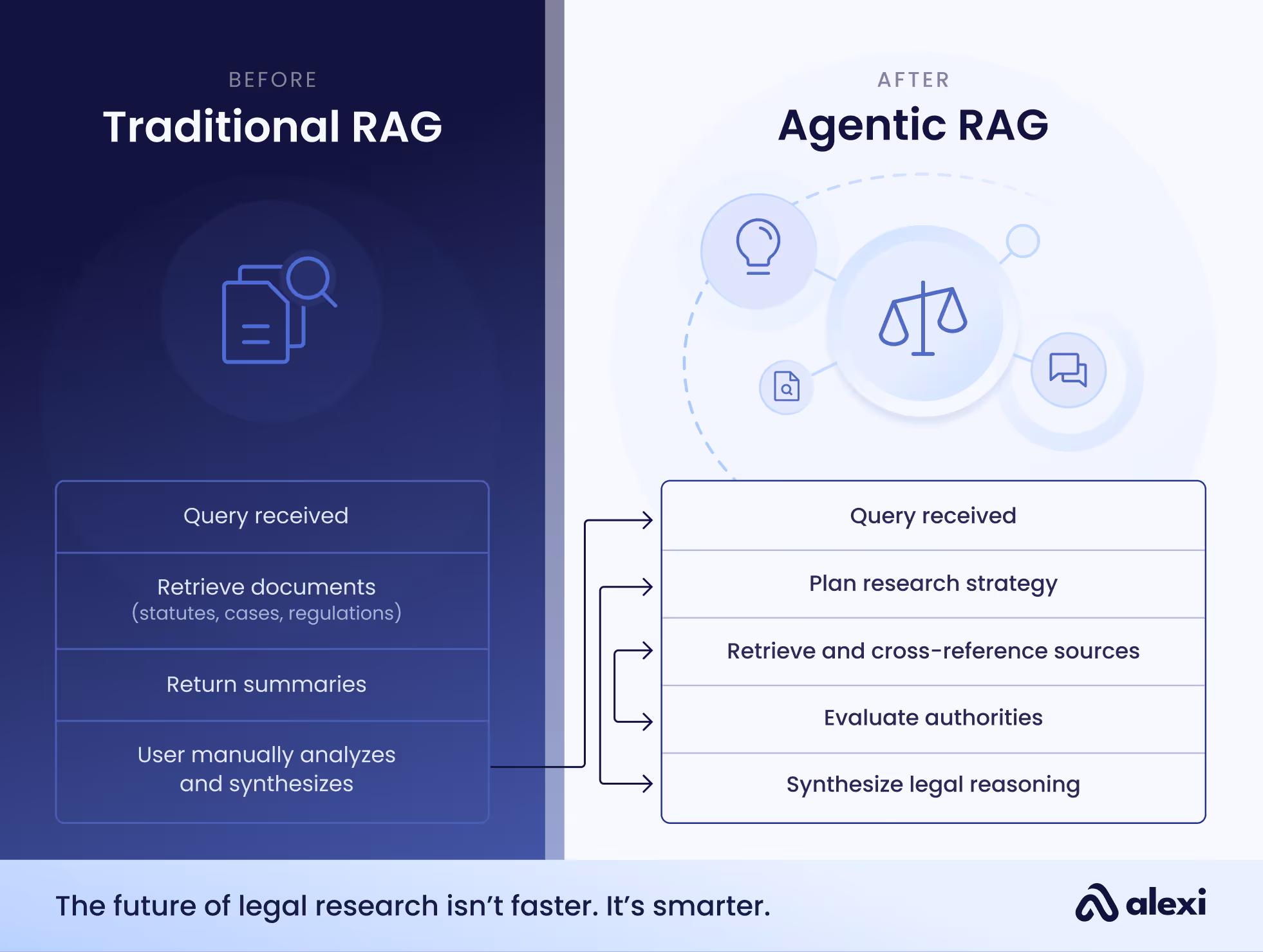 Understanding the transformative impact of Agentic Retrieval-Augmented Generation (RAG) over traditional RAG is crucial for maximizing AI-driven legal reasoning automation tools such as Alexi. But to truly grasp its potential, we must look at what happens when Agentic frameworks are specifically designed for legal research and legal reasoning.